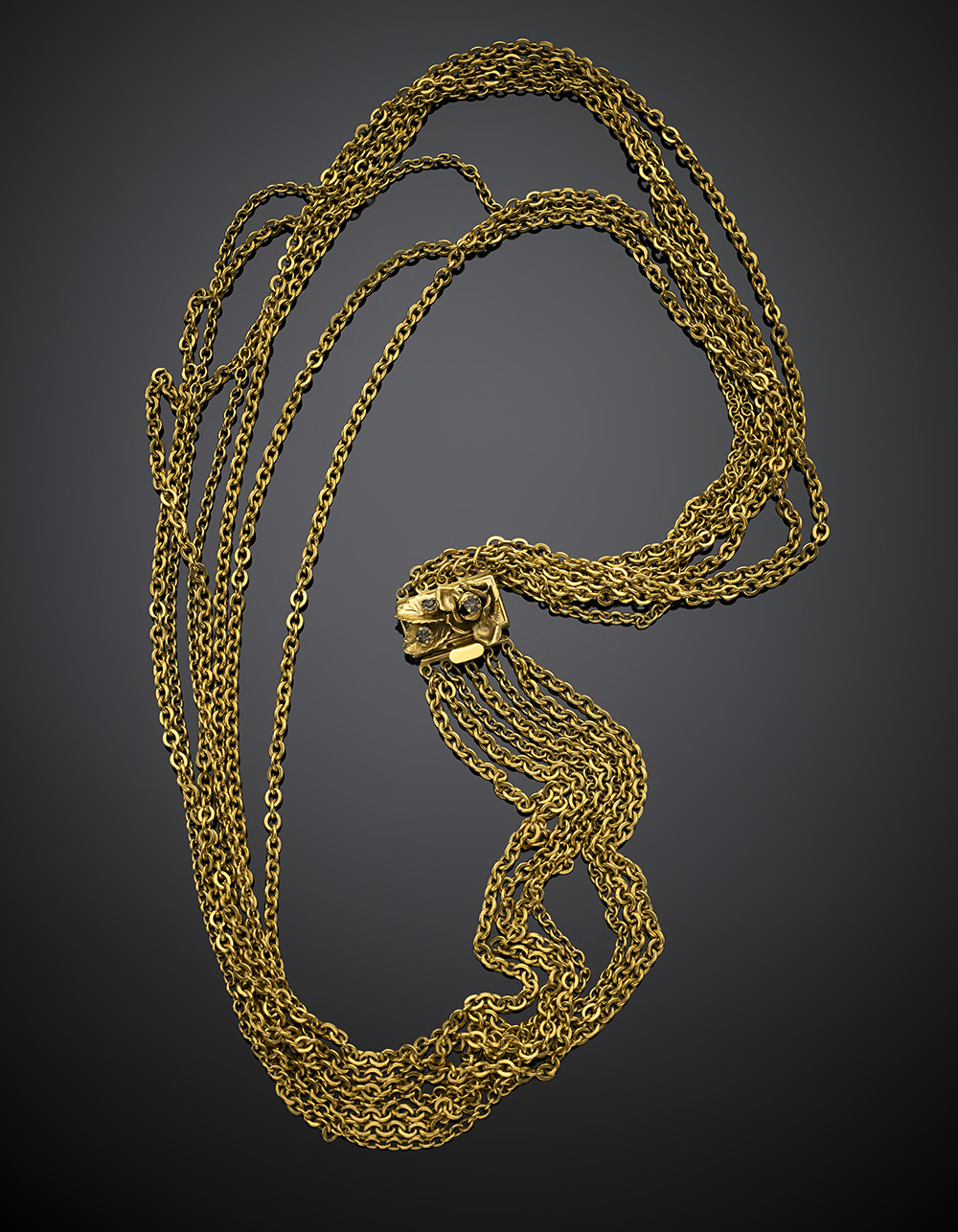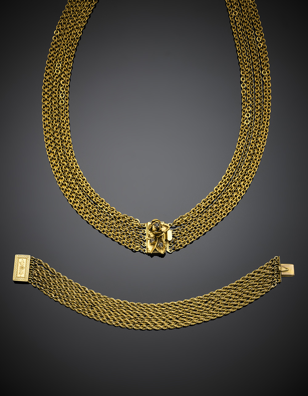 Lotto composto da collana a sette fili di maglia rolò piatta con chiusura rifinita in paste vitree lungh. 68.5 cm e bracciale a sei fili di maglia a fune lungh. 19.5 cm, tutto in oro giallo, complessivi g 115,53. Collana marcata GM.
