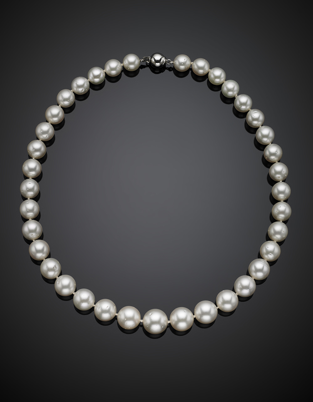 Collana di perle australiane con chiusura in oro bianco g 77,7, lungh. cm 46,5 circa. Marcato 31 PR.