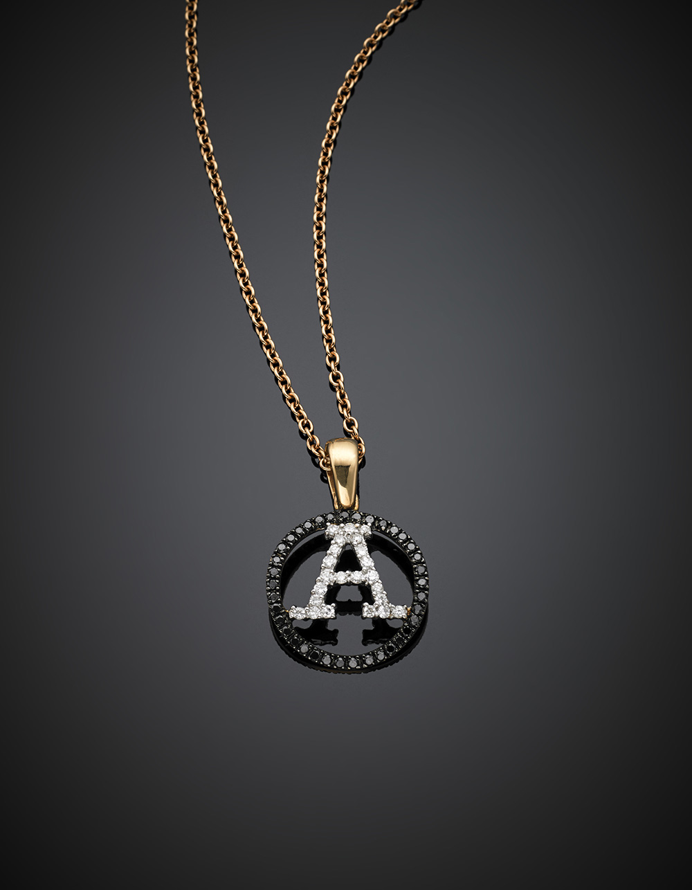 PInk gold chain and pendant accented with black and colourless diamonds in all ct. 0.75 circa, g 9.10, length cm 54 circa. Marked 2297 MI. With original guarantee