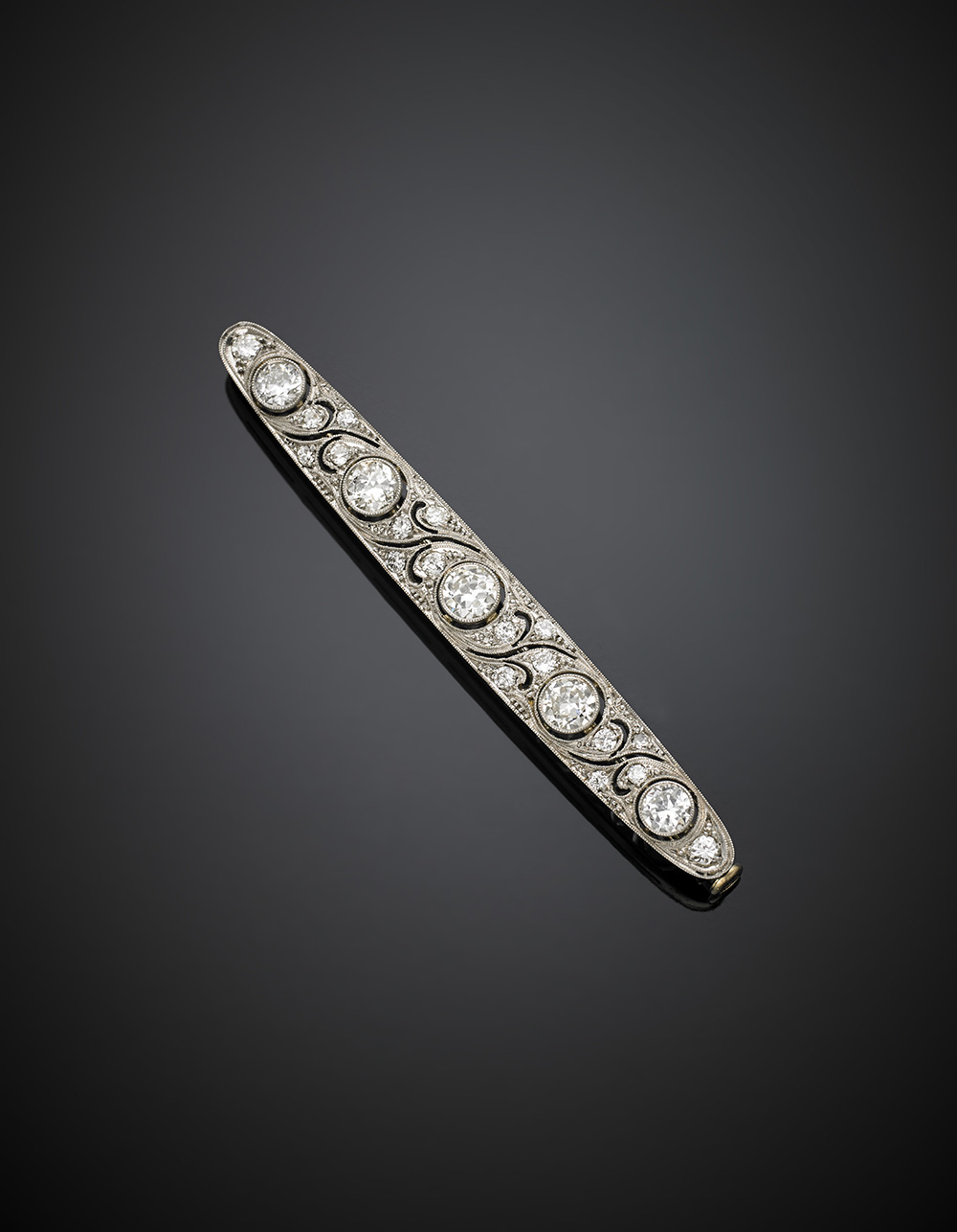 Spilla a barretta traforata in oro bianco 585/1000, platino e diamanti per complessivi ct. 2 circa, g 6,98, lungh. cm 6,2 circa. Marcata 585 e C con arpa.