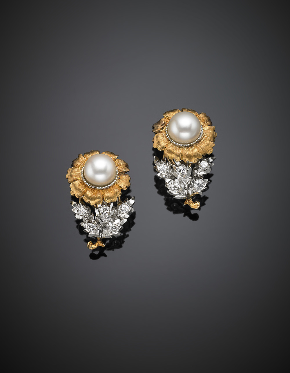 Orecchini in oro bianco e giallo in parte cesellato a guisa di fiori e foglie con diamanti per complessivi ct. 1 circa, perle a bottone di mm 9,25 circa, g 17,16, lungh. cm 3 circa.
