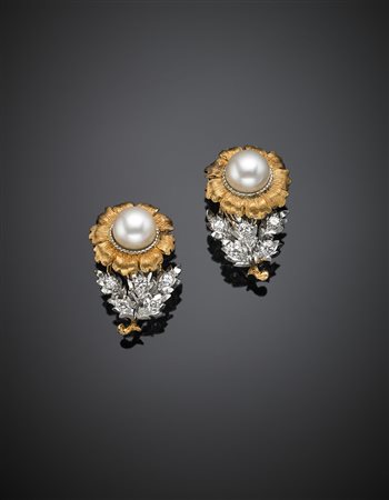 Bi-coloured partly chased gold, diamond mm 9.25 circa pearl flower earclips, diamonds in all ct. 1 circa, g 17.16, length cm 3 circa.