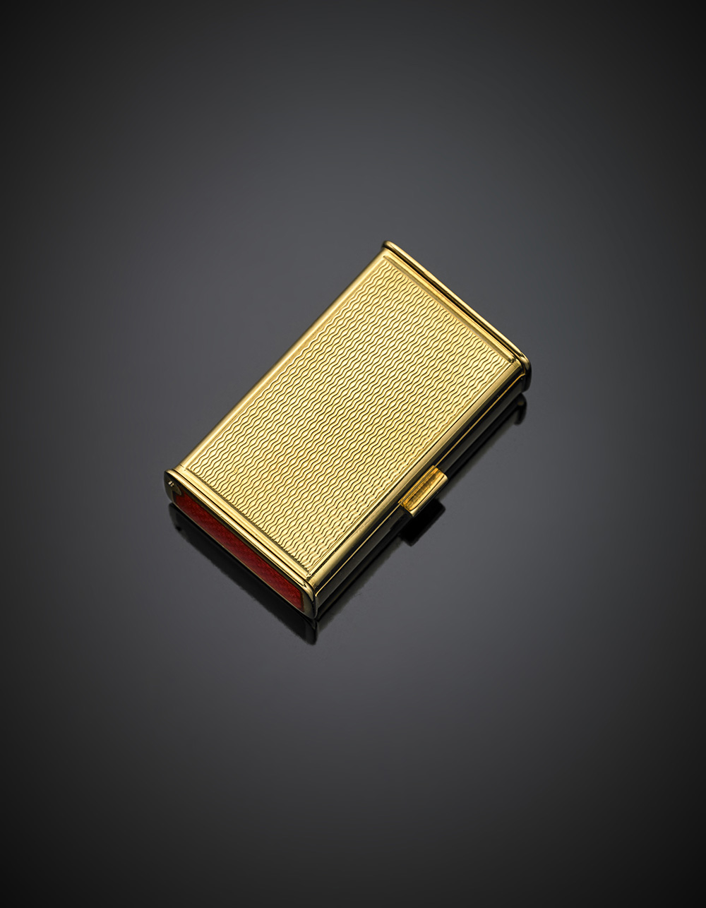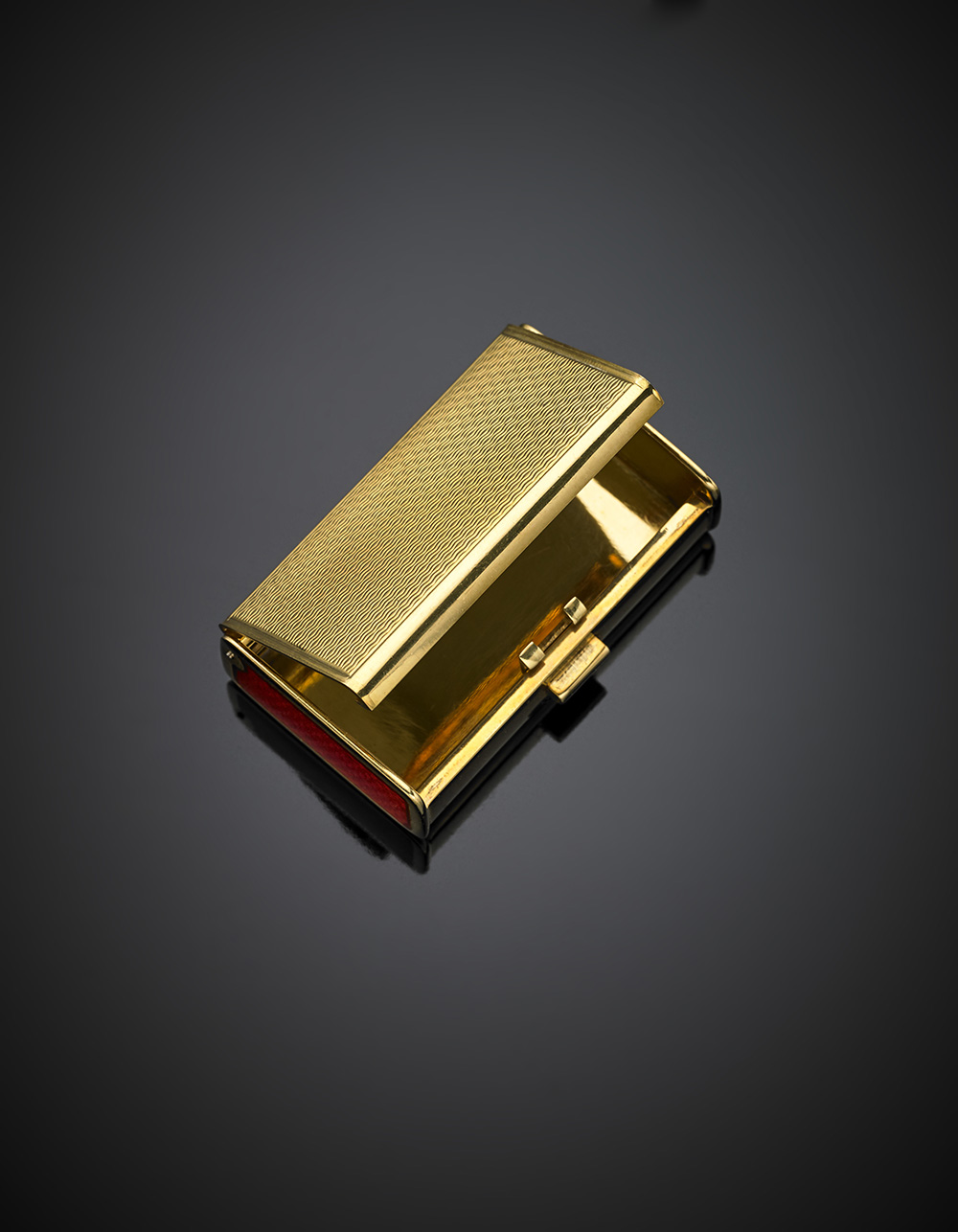Scatola in oro giallo cesellato con smalto rosso guilloché, g 36,03, lungh. cm 4,2, largh. cm 2,5 circa.