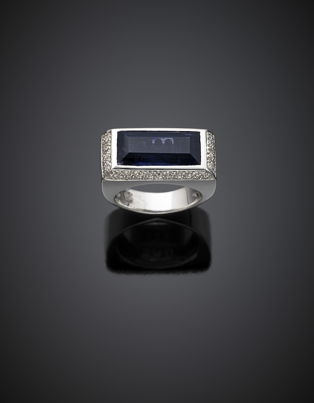 Anello in oro bianco con grande iolite rettangolare, taglio a gradini di ct. 3,75 circa, piccoli diamanti a rifinirla, g 14,78 misura 14/53. Traforato PVG.