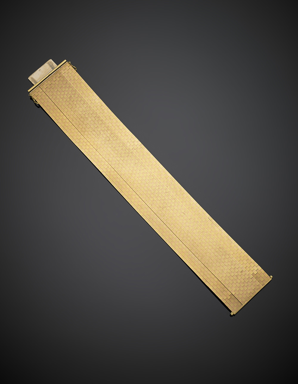 Bracciale a fascia in oro giallo e rosa con motivo a scacchiera, g 104,49, lungh. cm 20, largh. cm 3,2 circa. Marcato 59 VR.