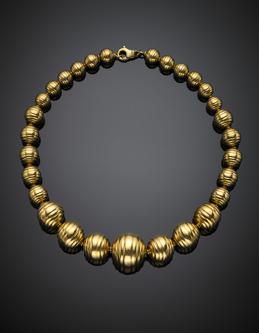 Collier in oro giallo a boules rigate a scalare, g 71,78, lungh. cm 46 circa.