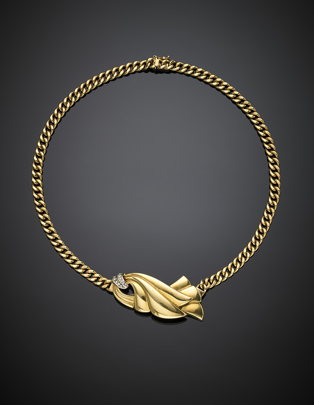 Collier in oro giallo a maglia groumette con centrale rifinito in oro bianco e diamanti, una spilla di sicurezza sul retro, g 37,48, lungh. cm 44 circa. Marcato UNOAERRE, 1 AR.