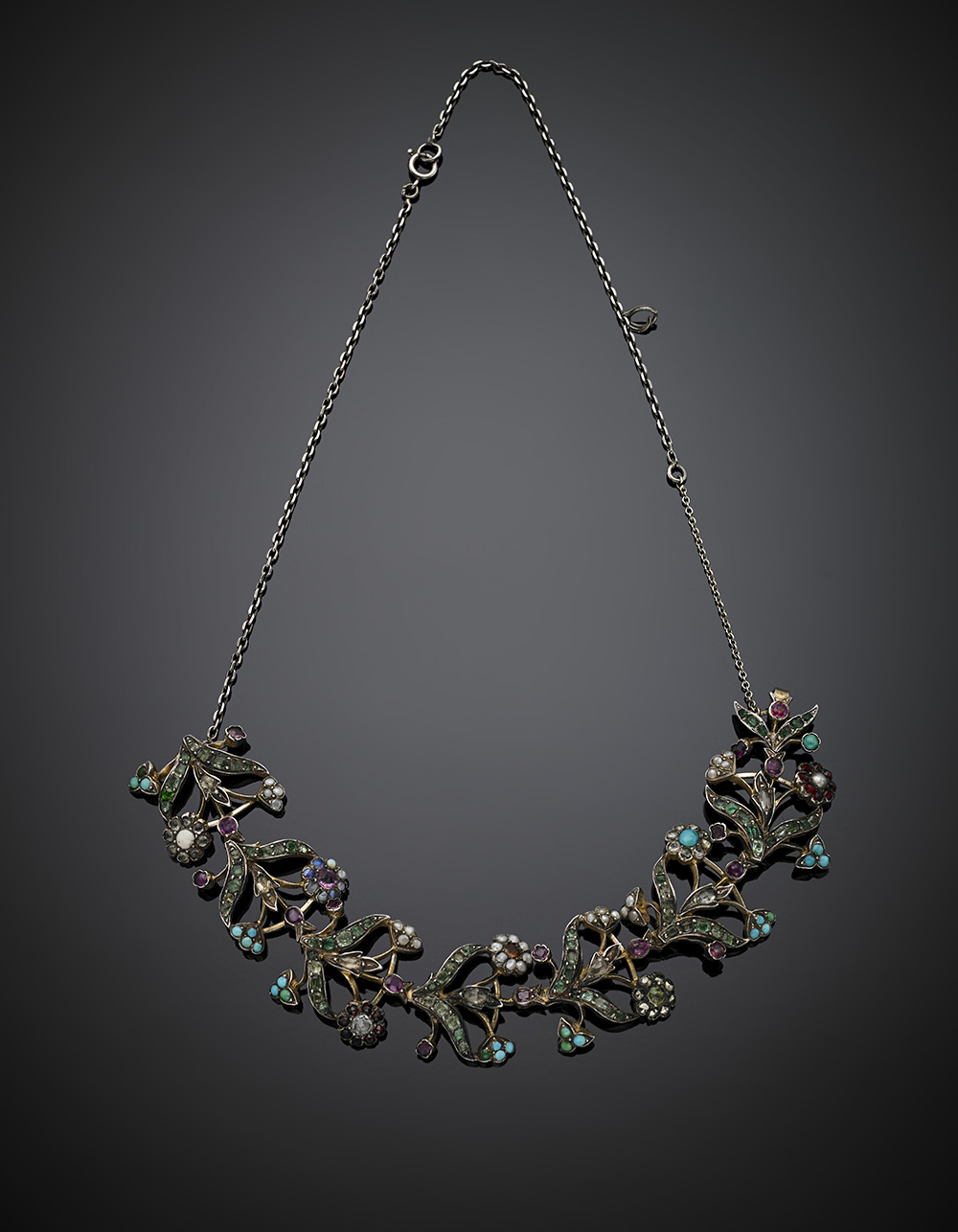 Turquoise, diamond and gemset adjustable modular floral bracelet, adaptable as choker with a chain , g 47.71, length cm 20.5, width cm 2.7 circa. French import hallmarks.