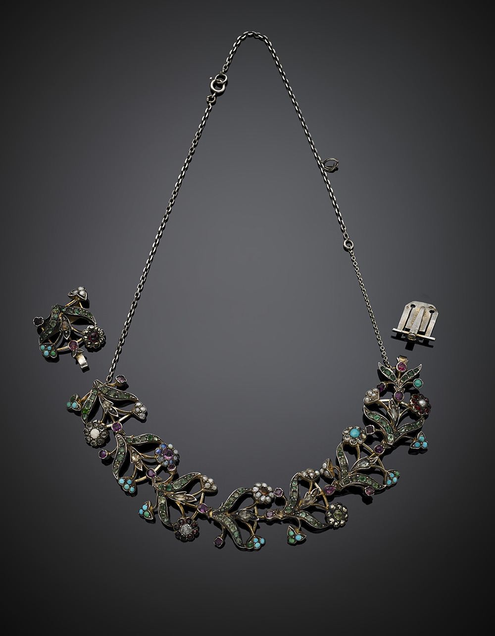 Bracciale modulare adattabile e trasformabile in collana chocker in argento in parte dorato con turchesi, perle, diamanti e gemme varie, g 47,71, lungh. cm 20,5, largh. cm 2,7 circa. Marchi francesi di importazione.