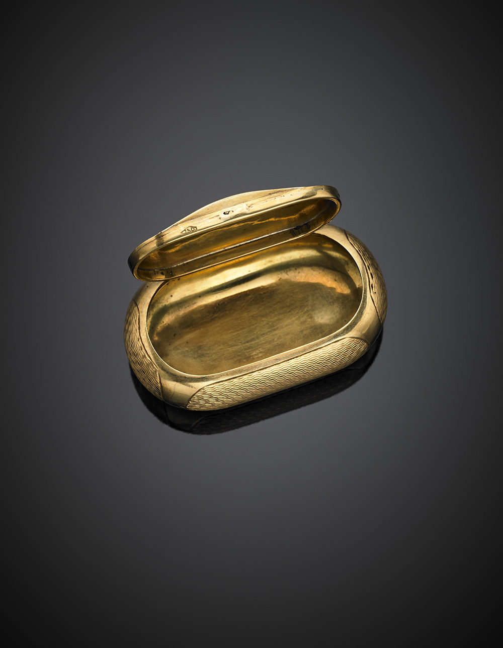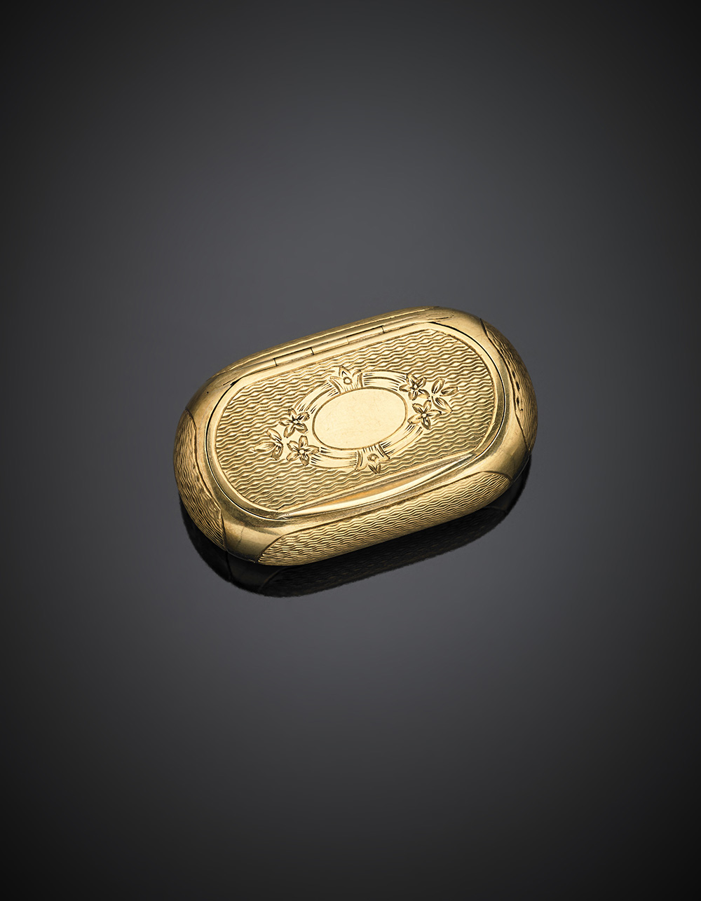 Scatola in oro giallo cesellato a profilo bombato, g 28,53, lungh. cm 4,5, largh. cm 2,8 circa.