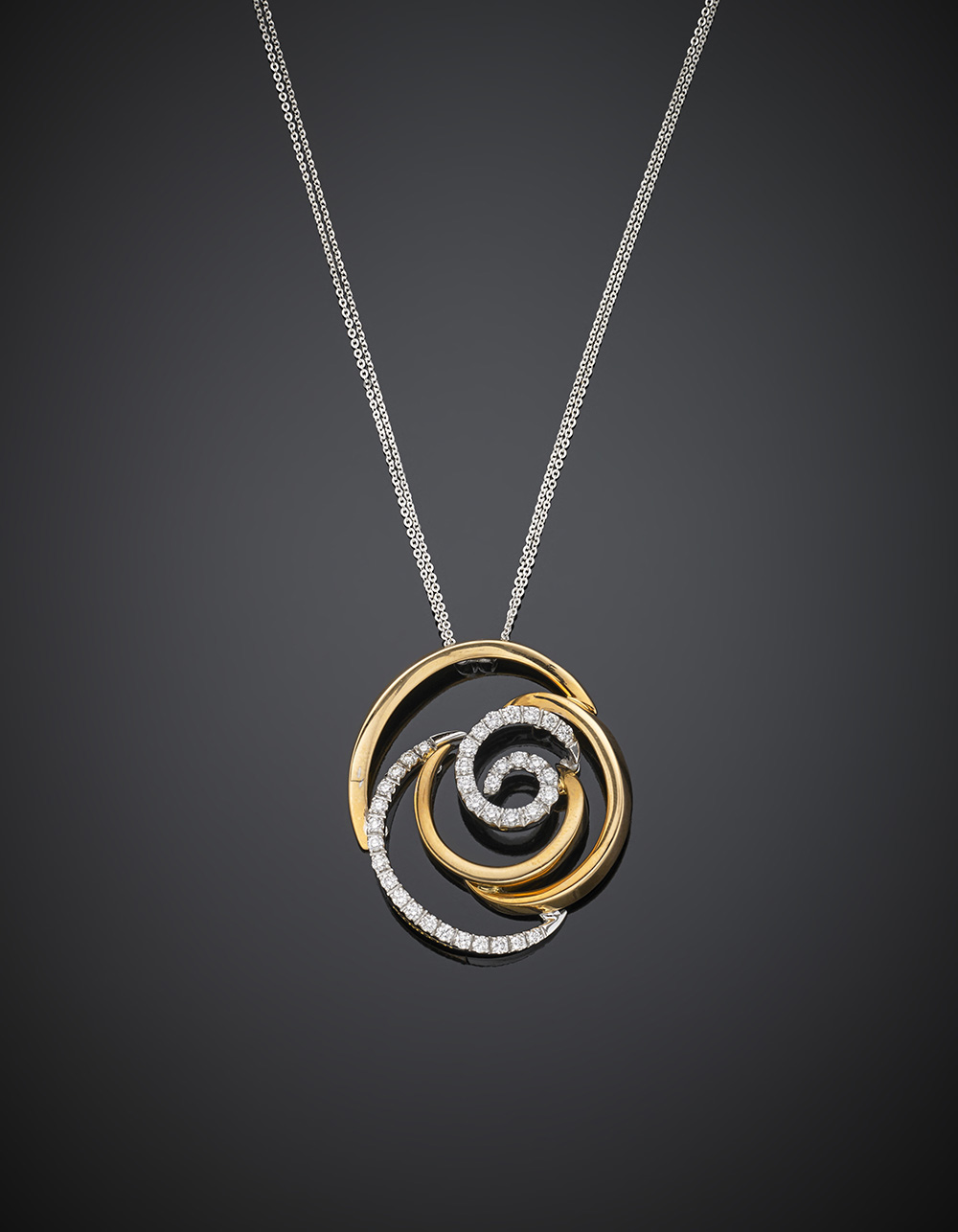 White and pink gold, diamond coil pendant with double linkchain, in all ct. 0.90 circa g 14.74. Pendant and chain signed DAMIANI; Made in Italy, 9161 AL, 7. With original case and Guarantee