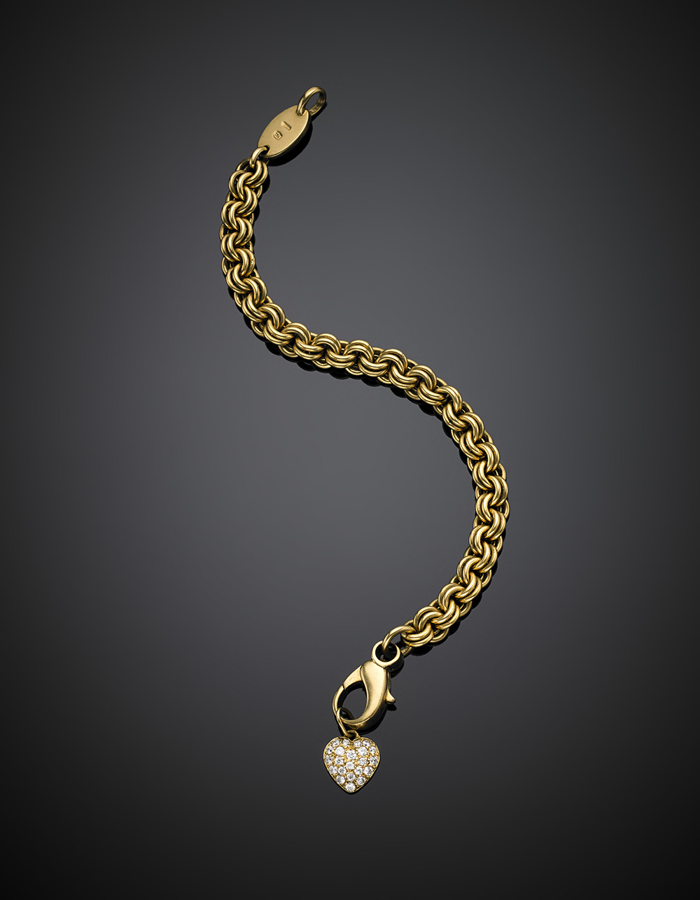 Bracciale in oro giallo a catena con pendente a cuore in paste vitree, g 40,52, lungh. cm 19,2 circa. Marcato 18/5/1982, 402 MI.