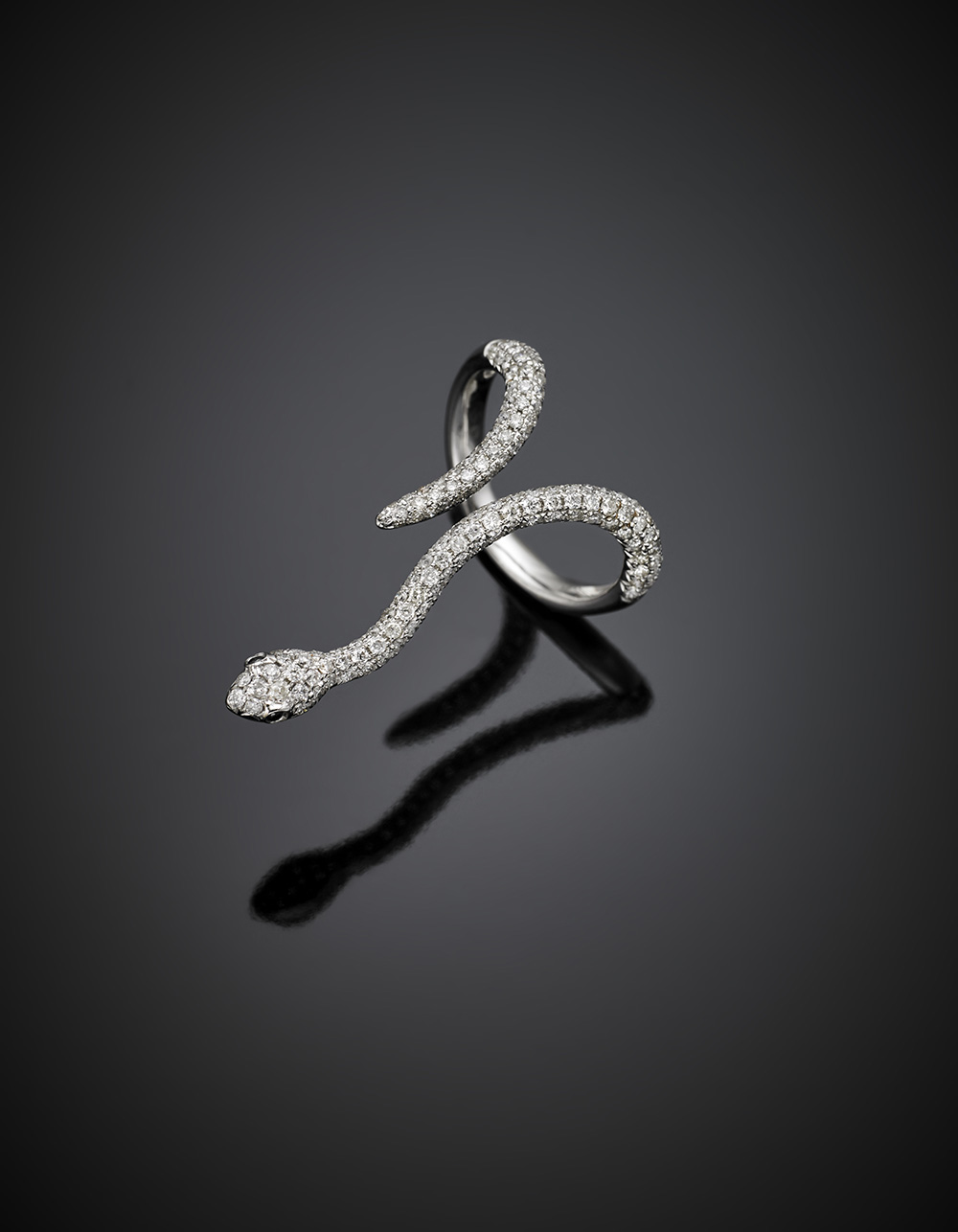 Anello in oro bianco e diamanti a pavè per complessivi ct. 0,80 circa a guisa di serpente, g 3,59 misura 11/51. Marchio a forma di diamante.