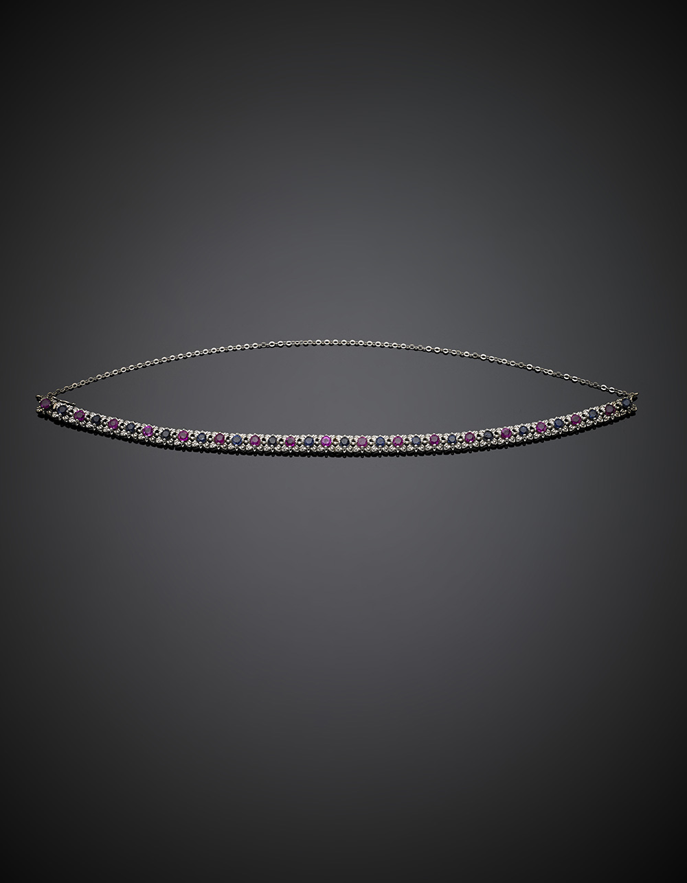 Collier in oro bianco con rubini per complessivi ct. 2,40 circa, zaffiri per complessivi ct. 2,40 circa, catena sul retro, g 19,62, lungh. cm 18 circa. (difetti)