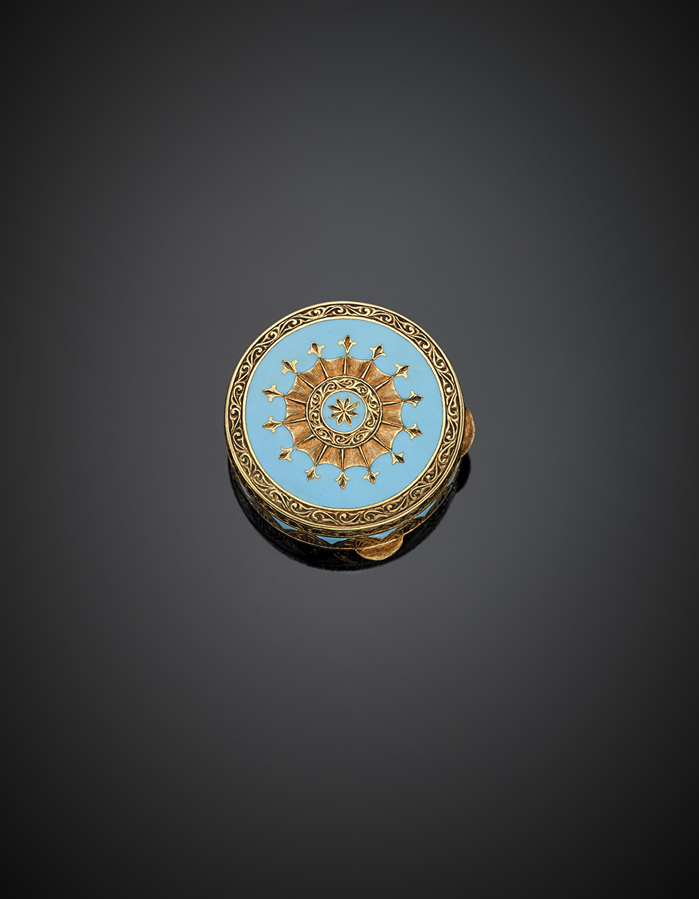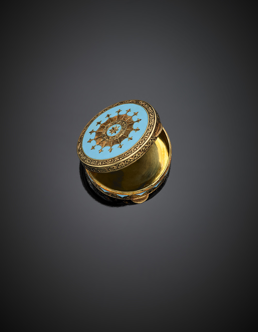 Scatola rotonda in oro giallo cesellato e smalto azzurro, g 23,49, diam. cm 3.