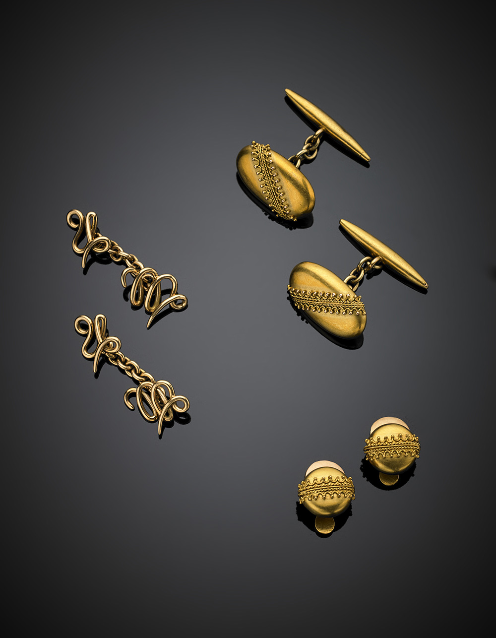 Lotto in oro giallo composto da due coppie di gemelli, una con bottoni da...