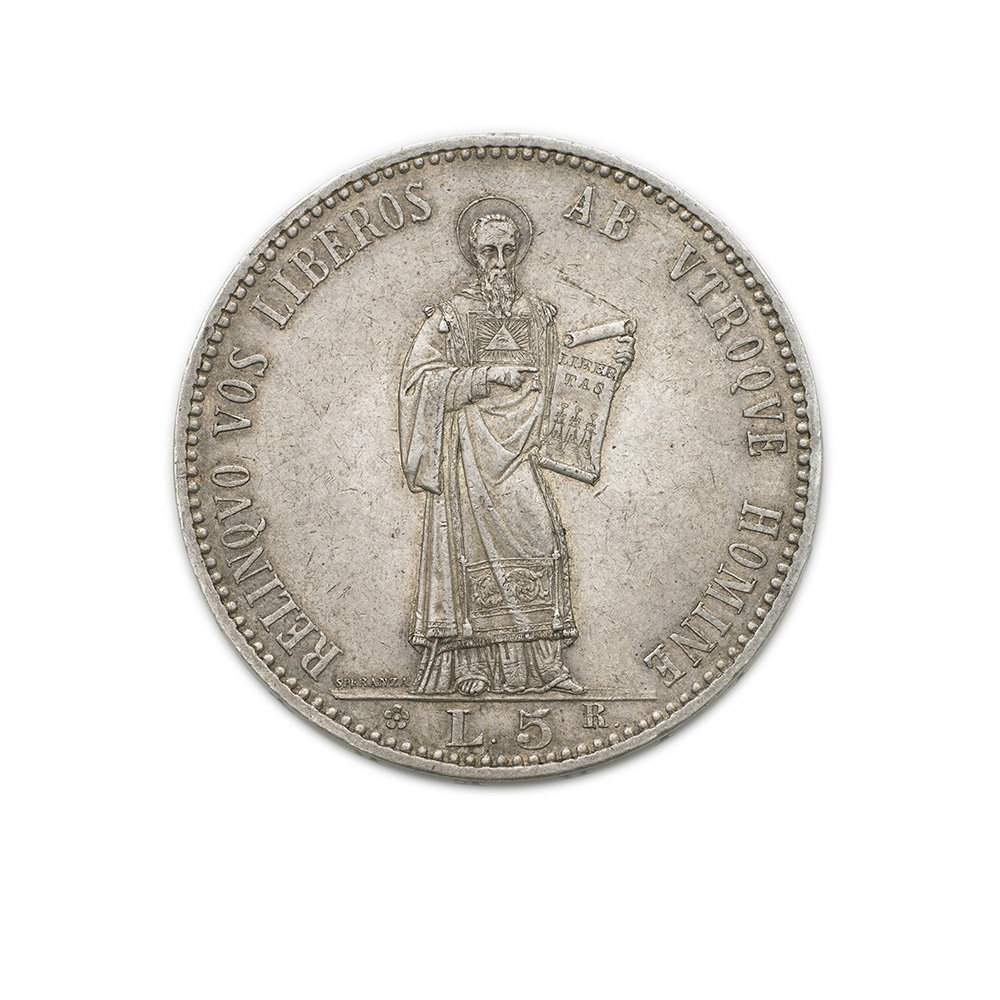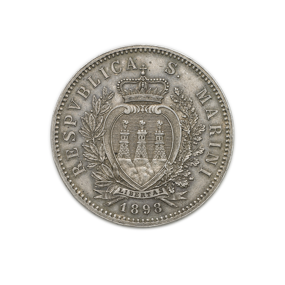 SAN MARINORepubblica. 5 lire 1898. Pag. 357. AG. Raro. Segnetti al R/. SPL.