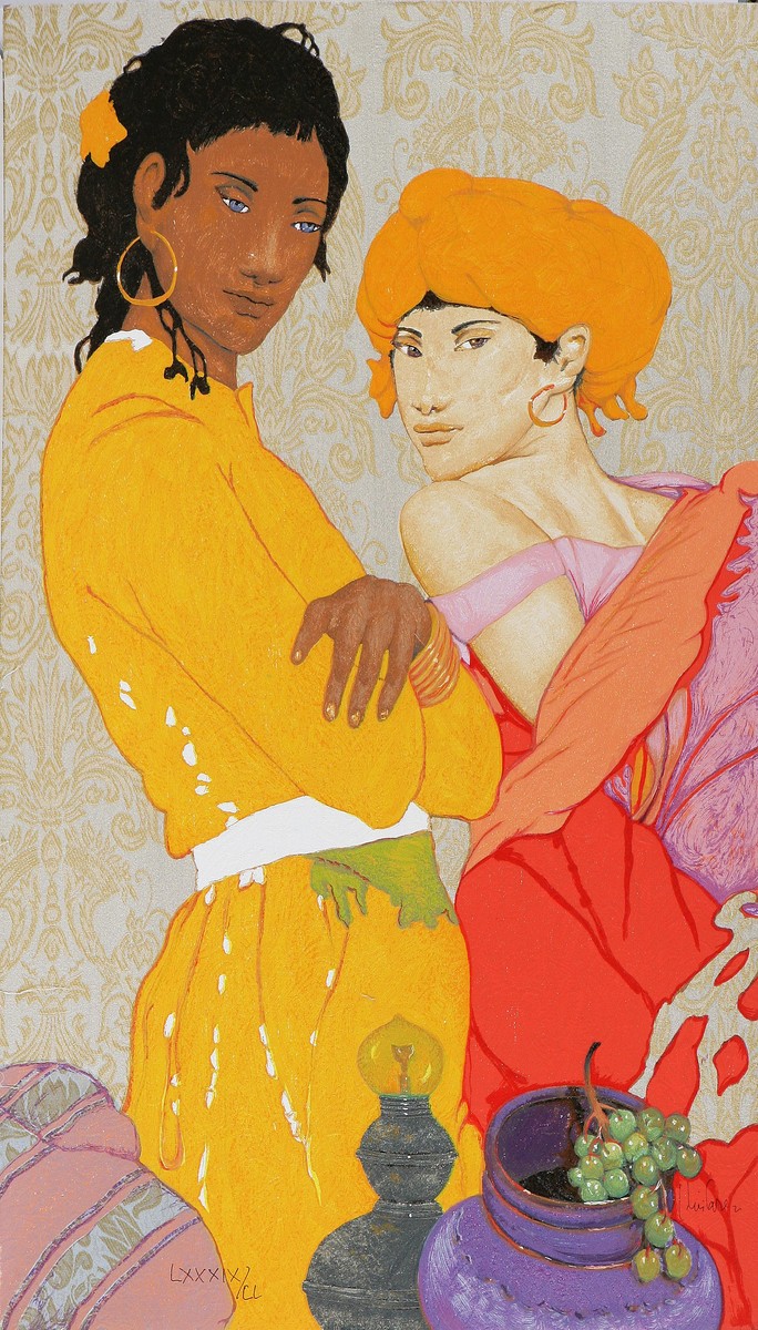 CIVITARESE GIORGIO (n. 1936) Figure con natura morta. Serigrafia polimaterica su stoffa damascata. Cm 60x100. Tir. LXXX1X/CL in basso a destra. Al retro cartiglio descrittivo Galleria d'arte Nuovo Segno. Firma in basso a destra.