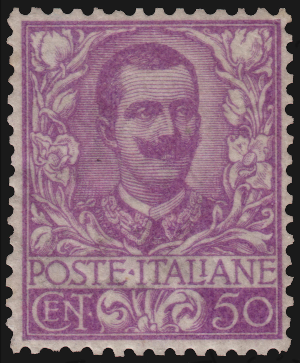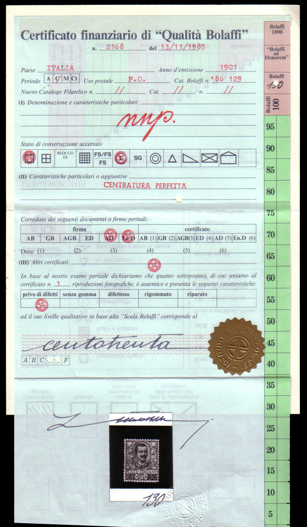 REGNO D'ITALIA 1901"Floreale". 50c. malvaCert. Finanziario...