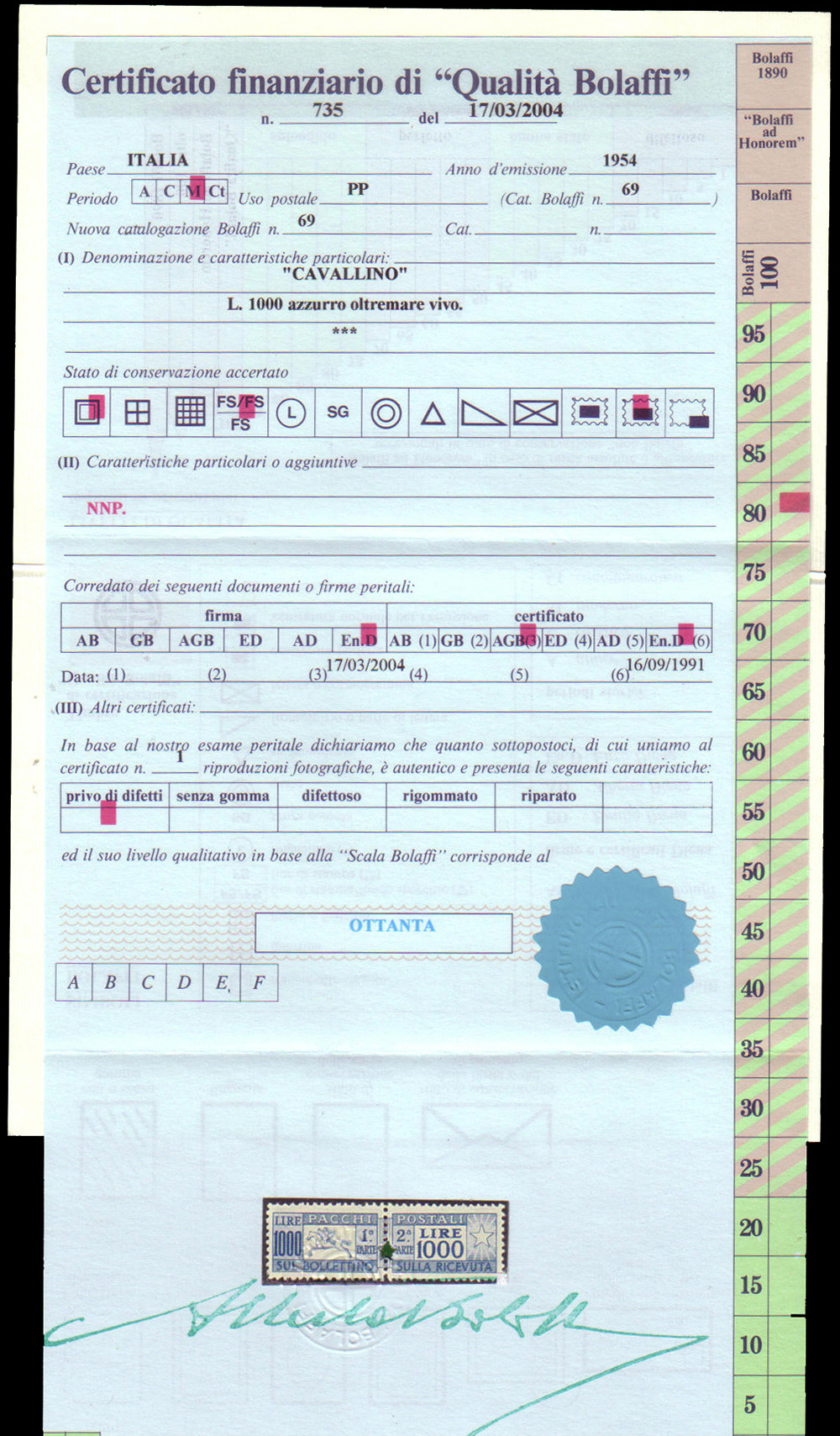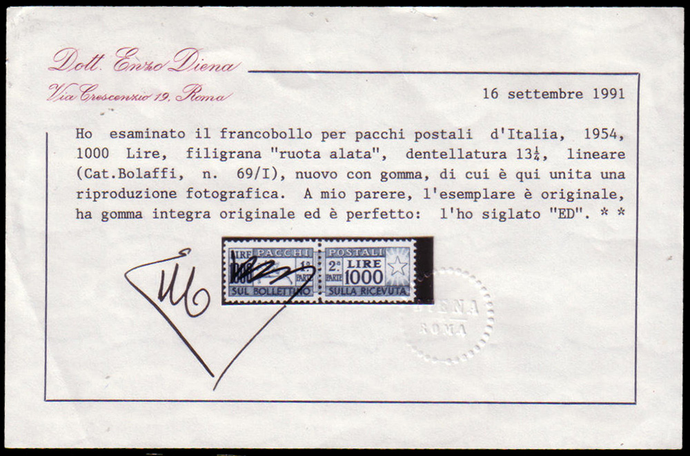 REPUBBLICA 1954Pacchi postali. 1000 lire "Cavallino", filigrana ruota,...