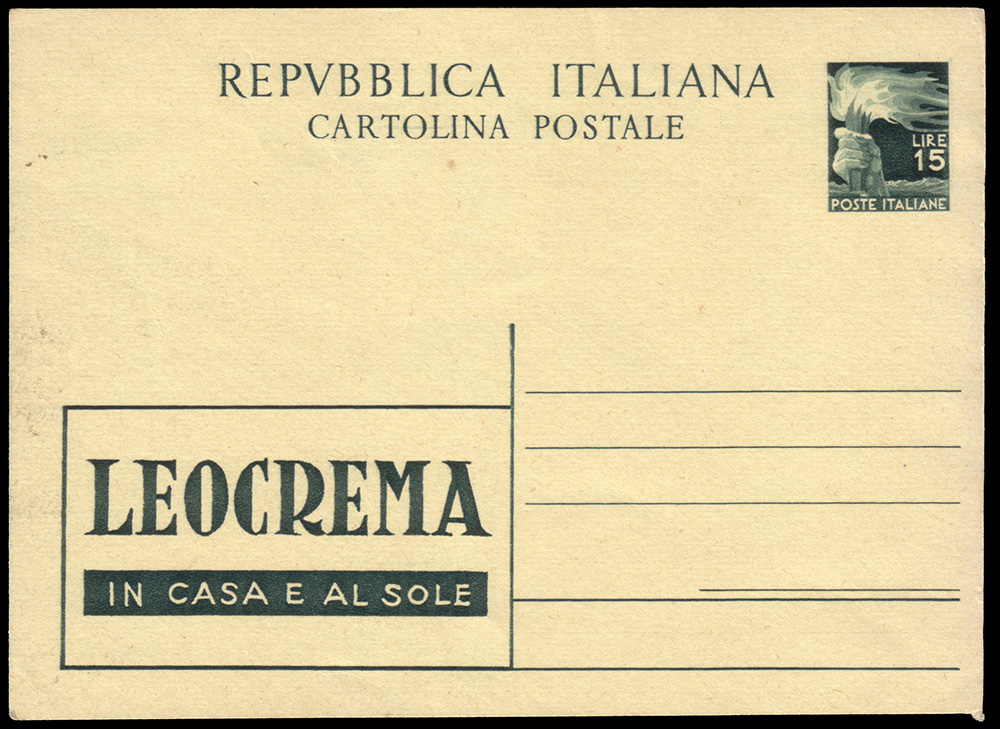 Cartolina postale pubblicitaria. 15 lire "Leocrema"
