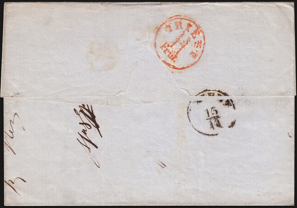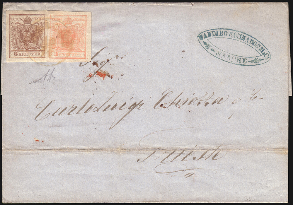 Lettera senza testo da Sarche per Trieste affrancata per 9kr. con 3kr. rosa e 6kr. bruno annullati con timbro in rosso di Sarche