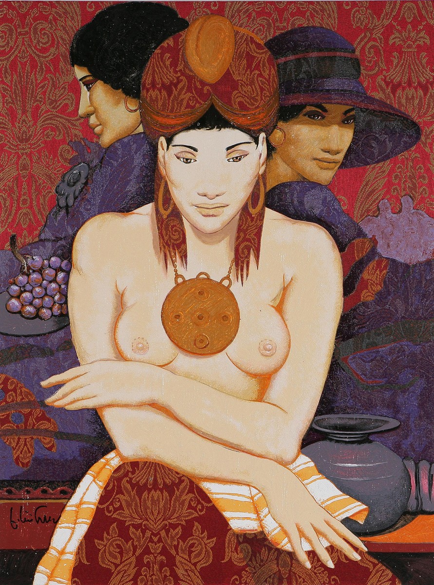 CIVITARESE GOFFREDO (n. 1936) Figure con natura morta. Serigrafia polimaterica su stoffa damascata. Cm 80x60. Tir. XXXX/C. Al retro cartiglio descrittivo Galleria d'arte Nuovo Segno. Firma in basso a sinistra.