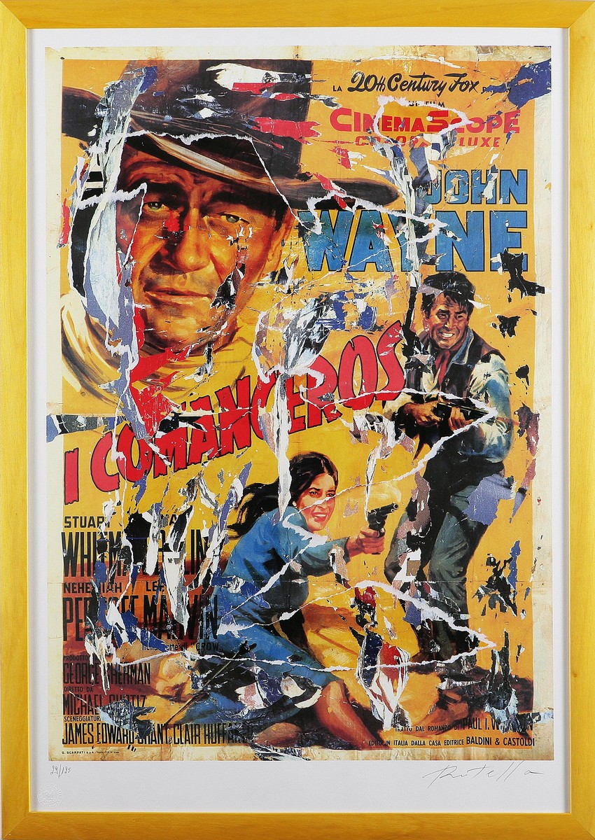 ROTELLA MIMMO (1918 - 2006) I Comanceros. Litodecollage. Cm 70x100. Tir. 29/125 a matita in basso a sinistra; timbro a secco della Fondazione Mimmo Rotella Milano. Firma a matita in basso a destra. Cornice presente.