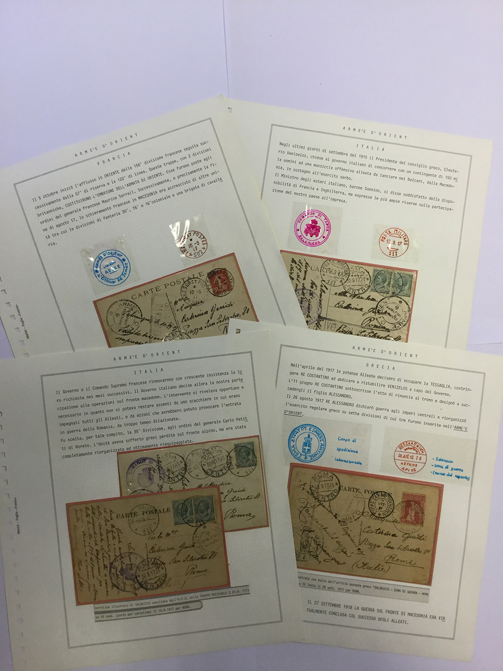 "Armée d'Orient", le operazioni in Macedonia. Collezione specializzata, montata su fogli d'album descrittivi, composta da oltre 40 cartoline, principalmente viaggiate, molte "fotografiche" che illustrano le operazioni militari dell'armata e la devastazione della città di Salonicco. Da esaminare
