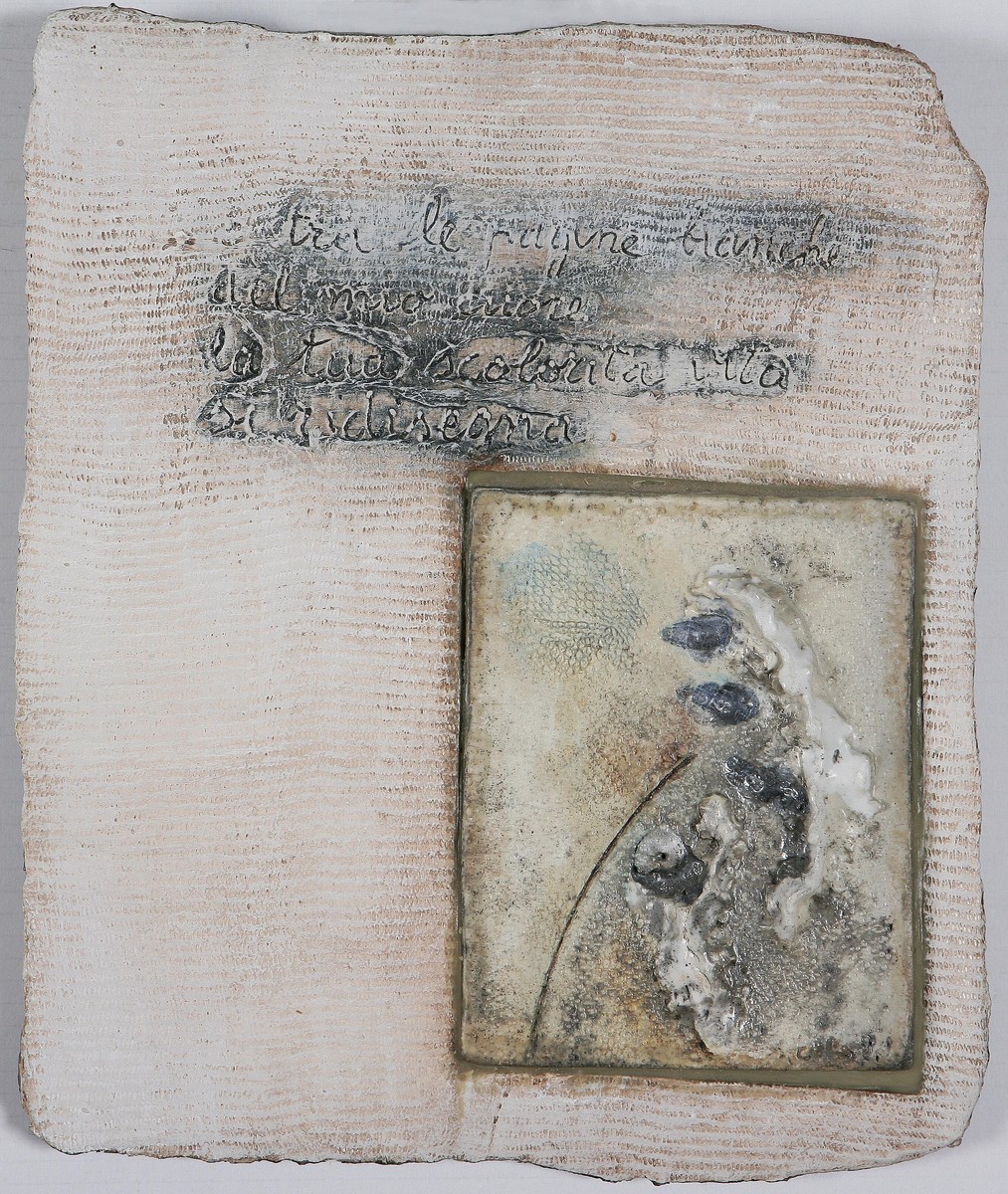 MAFFEI GINA (n. 1946) Tra le pagine bianche del mio cuore la tua scolorita vita si ridisegna. Ceramica. Cm 28x33. Firma in basso a destra.