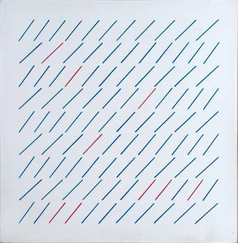 MARIO NIGRO Pistoia 1917 - Livorno 1992 INCONTRARSI, 1973 tempera su tela, cm 65x65. Firmato e titolato al verso: M. Nigro “incontrarsi”. Bibliografia: G. Celant, Mario Nigro. Catalogo ragionato, Skira, Milano 2009, n. 468, p. 406 (ill.). Opera accompagnata da autentica su fotografia firmata dall’artista