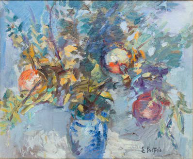 EZIO PASTORIO Cremona 1911 - Milano 2006 MELOGRANI, 1981 olio su tela, cm 50x60. Firmato in basso a destra: E. Pastorio. Provenienza: Milano, Galleria d’Arte Ponte Rosso (etichetta e timbri al verso). Opera accompagnata da autentica su fotografia della Galleria Ponte Rosso firmata dall’artista