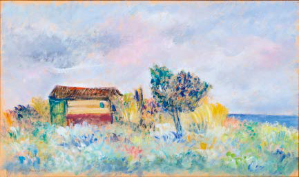 GIOVANNI OMICCIOLI Roma 1901 - 1975 PAESAGGIO tempera su carta applicata su tela, cm 33x55. Firmato in basso a sinistra: G. Omiccioli. Provenienza: Riccione, Galleria La Tavolozza (timbro al verso); Opera in corso di archiviazione presso la Fondazione Omiccioli, Roma