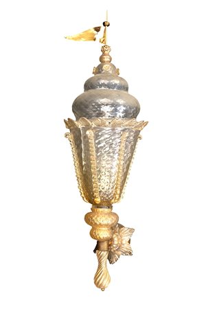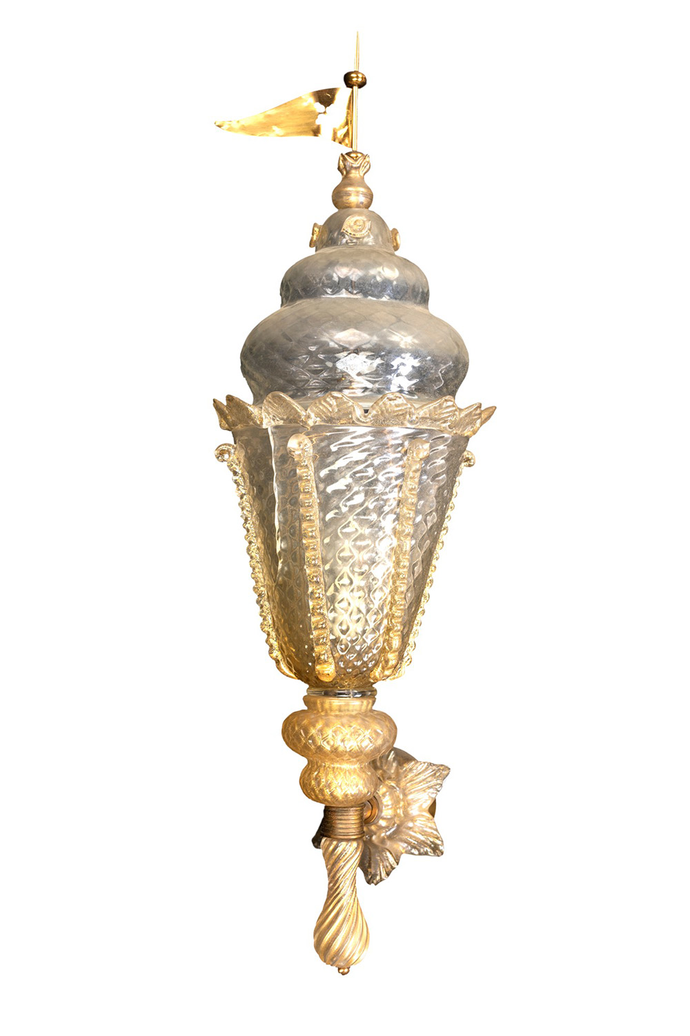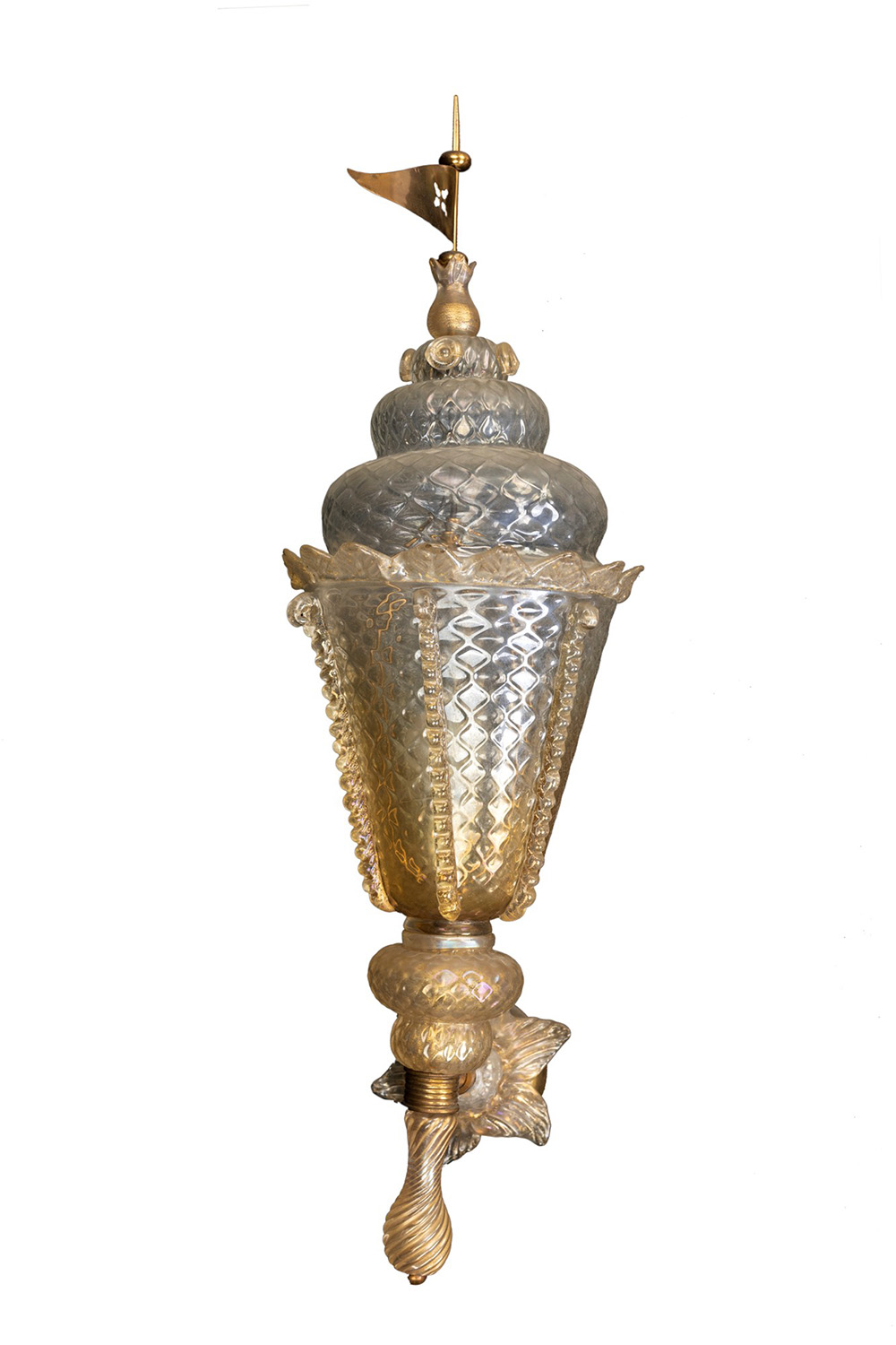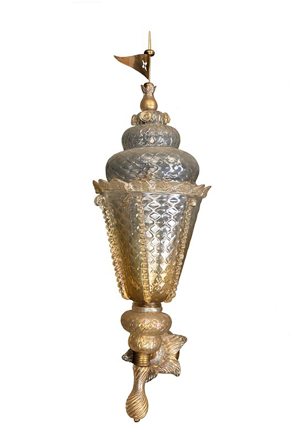 Coppia di appliques veneziane in vetro soffiato incolore e foglia d'oro...