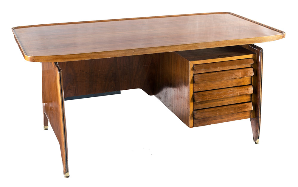 Scrivania in noce con quattro cassetti nel lato destro , dettagli in ottone...