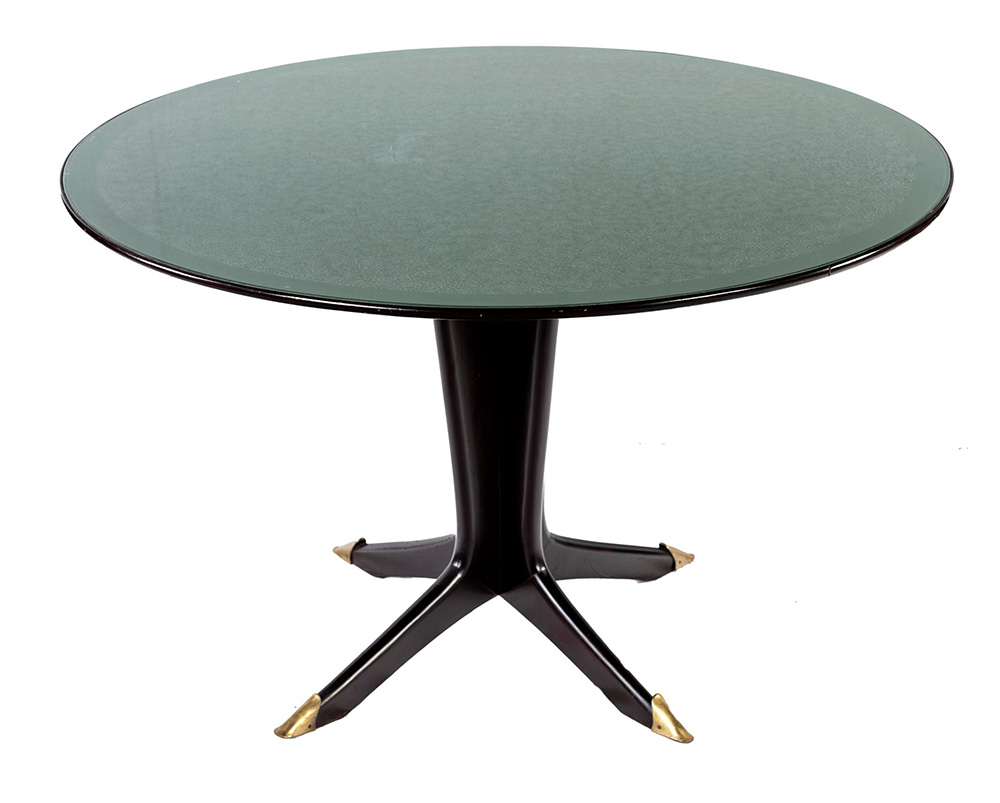 Tavolo con base centrale in legno ebanizzato ,piedini con finale in ottone e piano in vetro colorato grigio/verde lavorazione giapponese 1950 cm 75x117