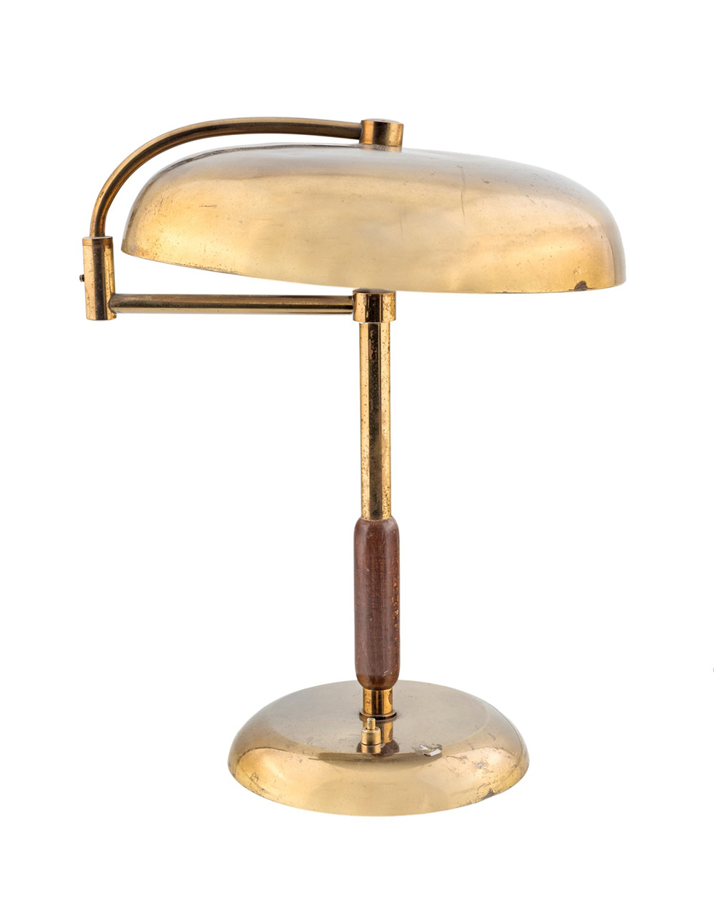Lampada da tavolo con diffusore e base in ottone , doppio snodo e braccio verticale in legno cm 4 0x36