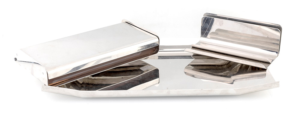 Servizio da scrittoio composto da un portalettere,"Ventotene" cm 7x20x10 scatola"Citera" cm 5x30x15 e vassoio" Arran" cm 48x25 in acciaio per DANESE Milano 1960