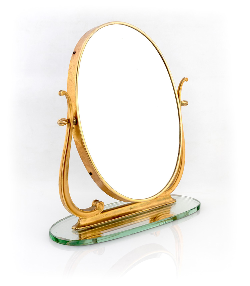 Specchio Orientabile da tavolo, struttura in ottone, base in vetro specchiato 1950 cm .46x40x17
