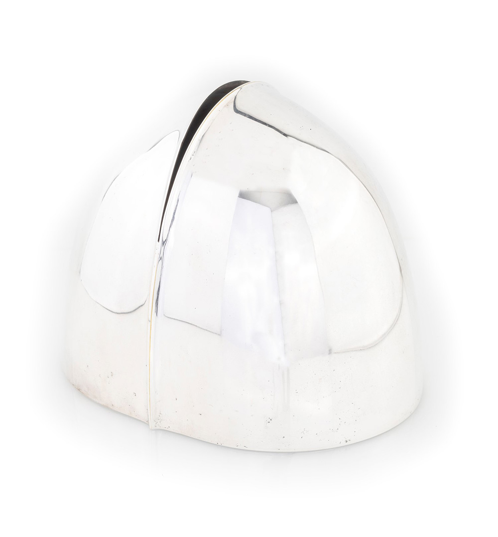 Vaso di forma appiattita con fessura centrale per contenere un fiore in metallo argentato . Christofle coll. Gallia 1970 20x23x16