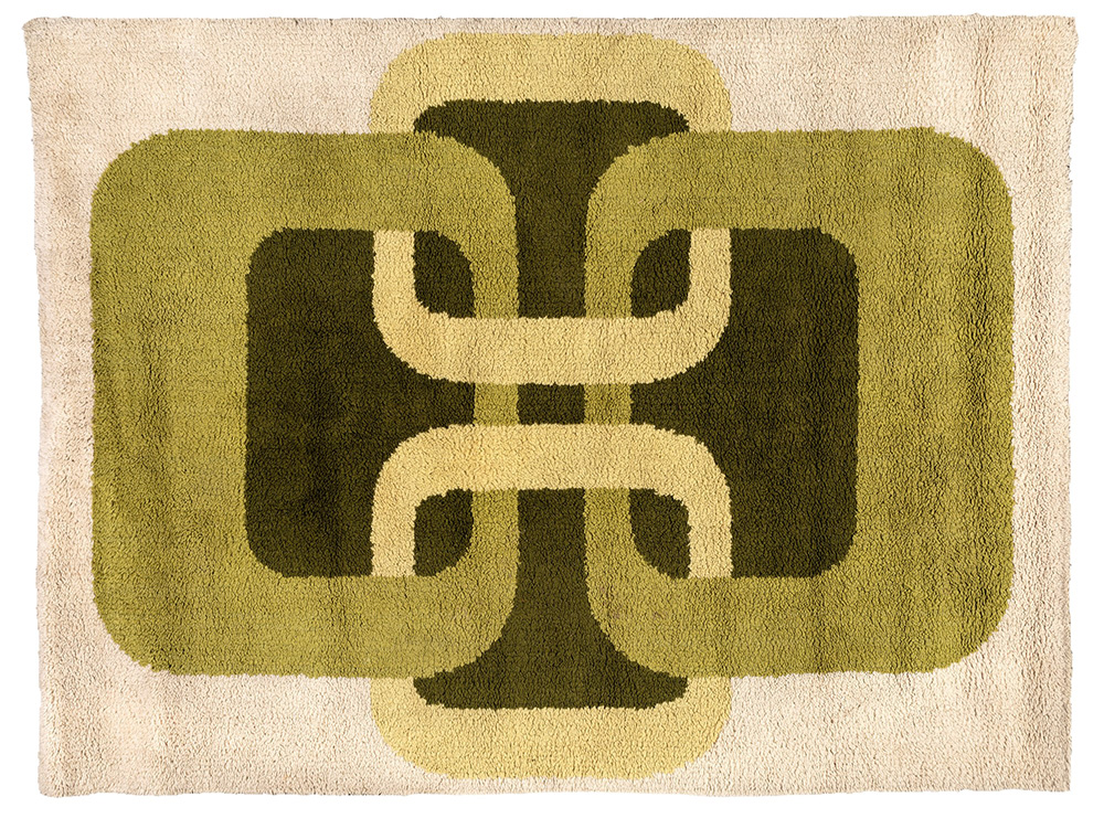 Tappeto in lana, pelo medio colori e disegni tipici dell'epoca verde chiaro e scuro 1970 cm2.25x1.65