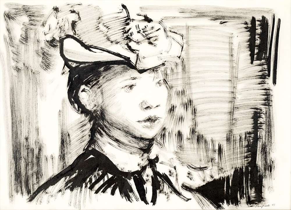Domenico Purificato Fondi 1915-Roma 1984, FIGURA DI DONNA CON CAPPELLO 1963 Tempera su carta 50x69 cm Firma e data in basso a destra "Purificato '63".