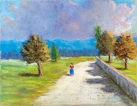 Pittore del XX secolo 0-0, Paesaggio con figura 1934 tempera e pastello su...
