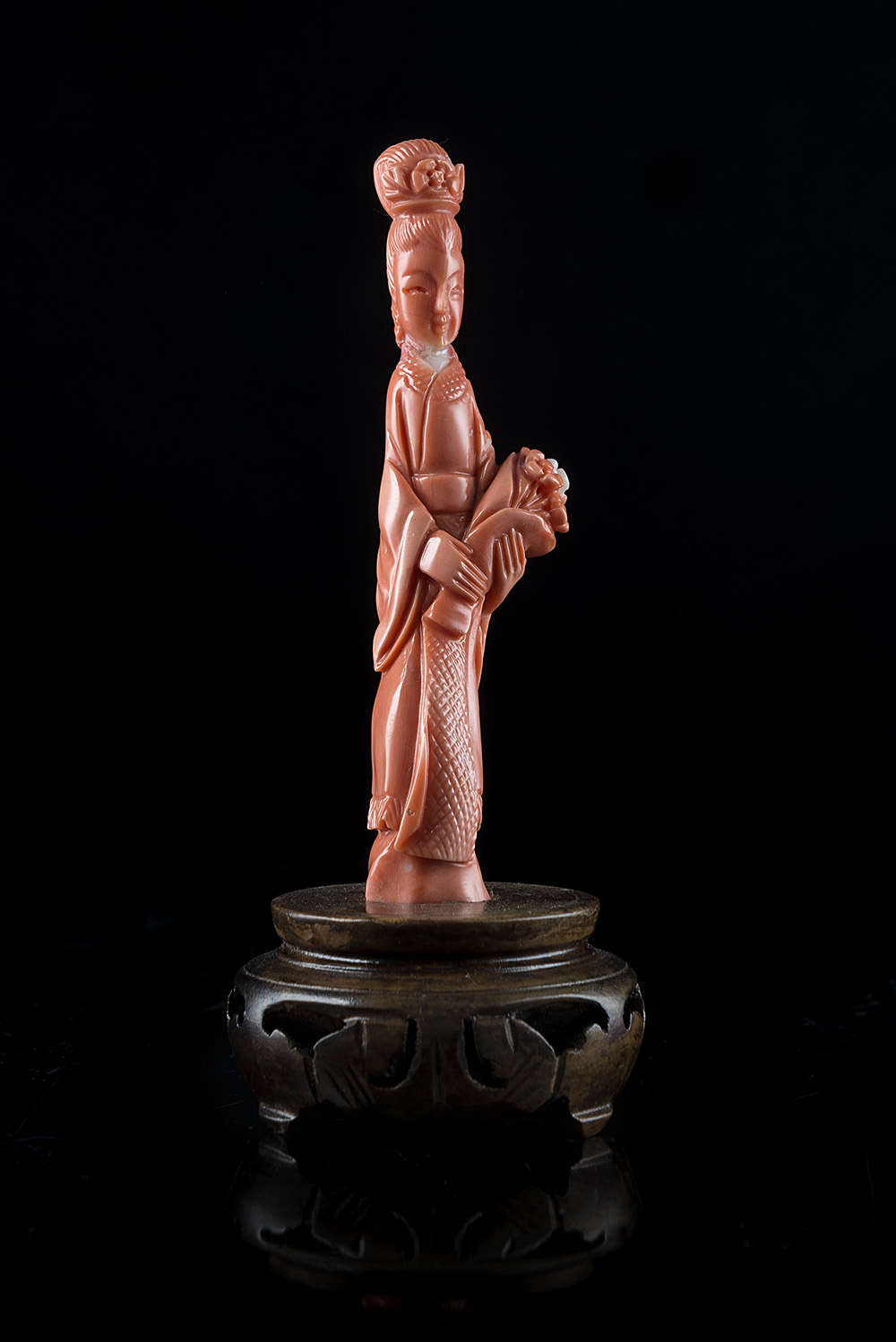Piccola dama con fiori scolpita in corallo, con base in legnoCina, inizio...