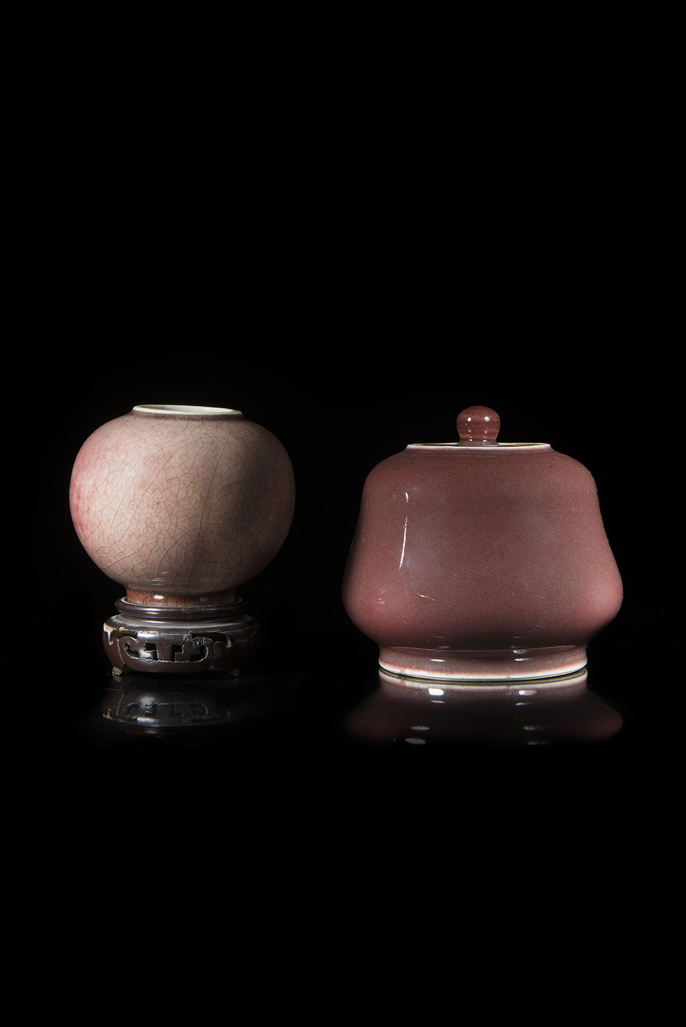 A small potiche and cover and a rounded small vesse all in monochrome-glazed porcelain, wood base (slight defects)