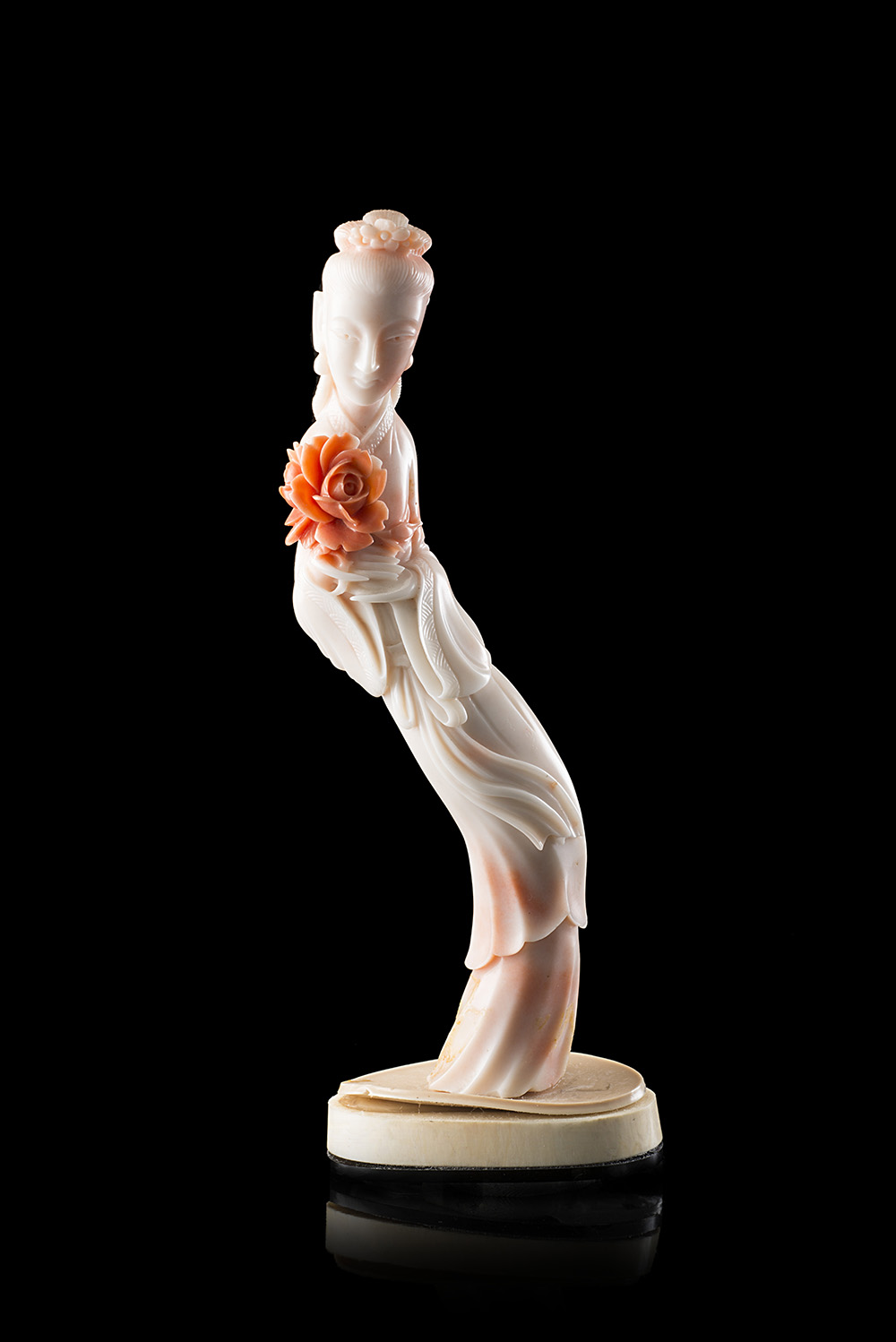 Scultura in corallo rosa pallido raffigurante dama dalle lunghe vesti, base in osso (lievi difetti)