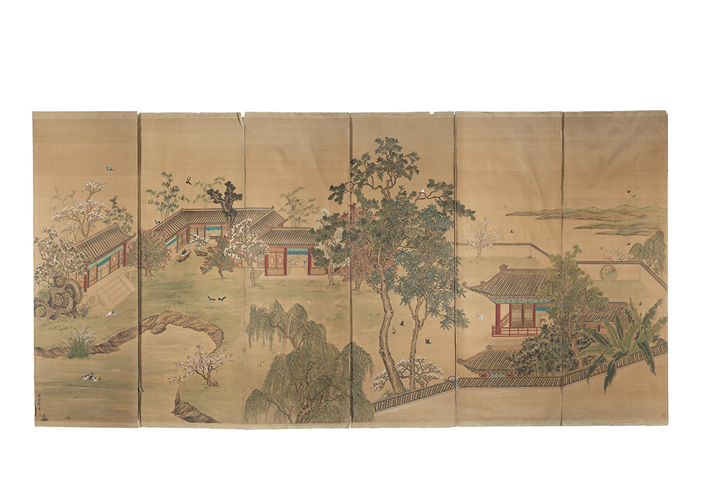 Paravento a sei pannelli decorato con padiglioni in giardini, inchiostro e colore su seta, montato su supporto (difetti)