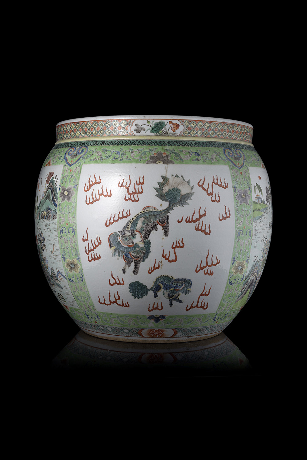 Lotto 32 | Grande giardiniera in porcellana Famiglia Verde decorata con leoni Buddhisti...