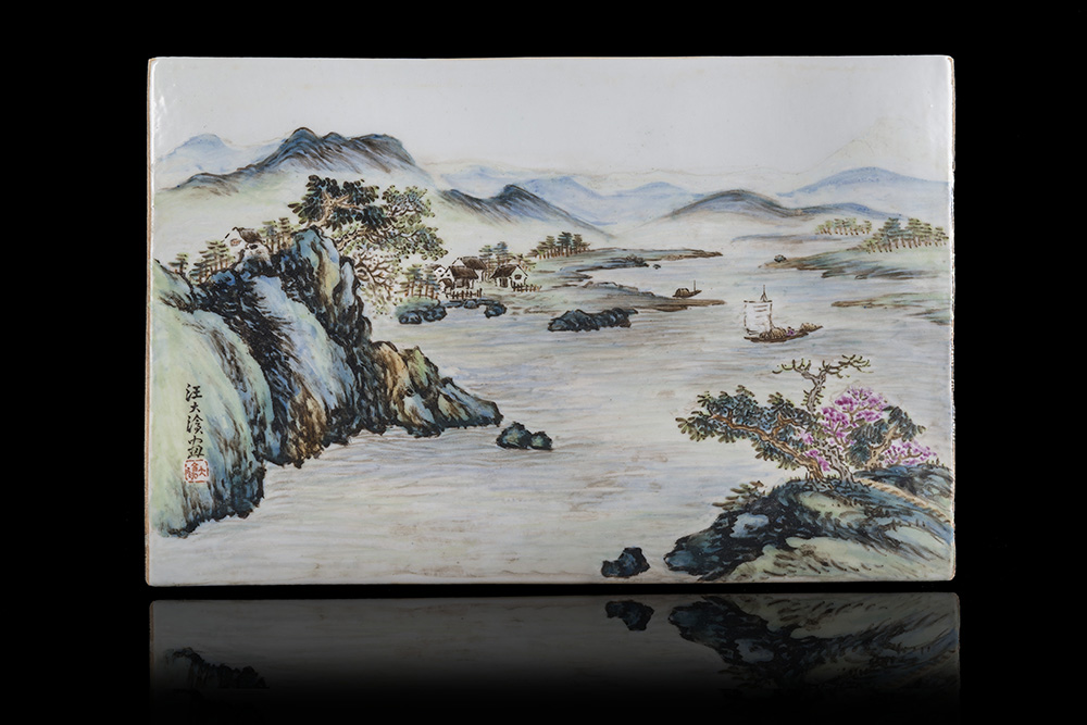 A rectangular porcelain plaque painted with a landscape scene, with calligraphy and seal reading "wang da cang"