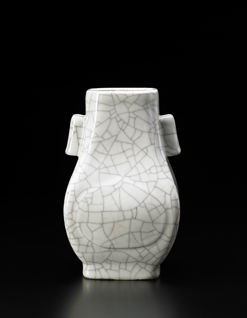 A crackleware porcelain vase, of archaistic shape, hu, of lobed rectangular section with twin tubular handles, the smooth pale glaze with a fine crackling